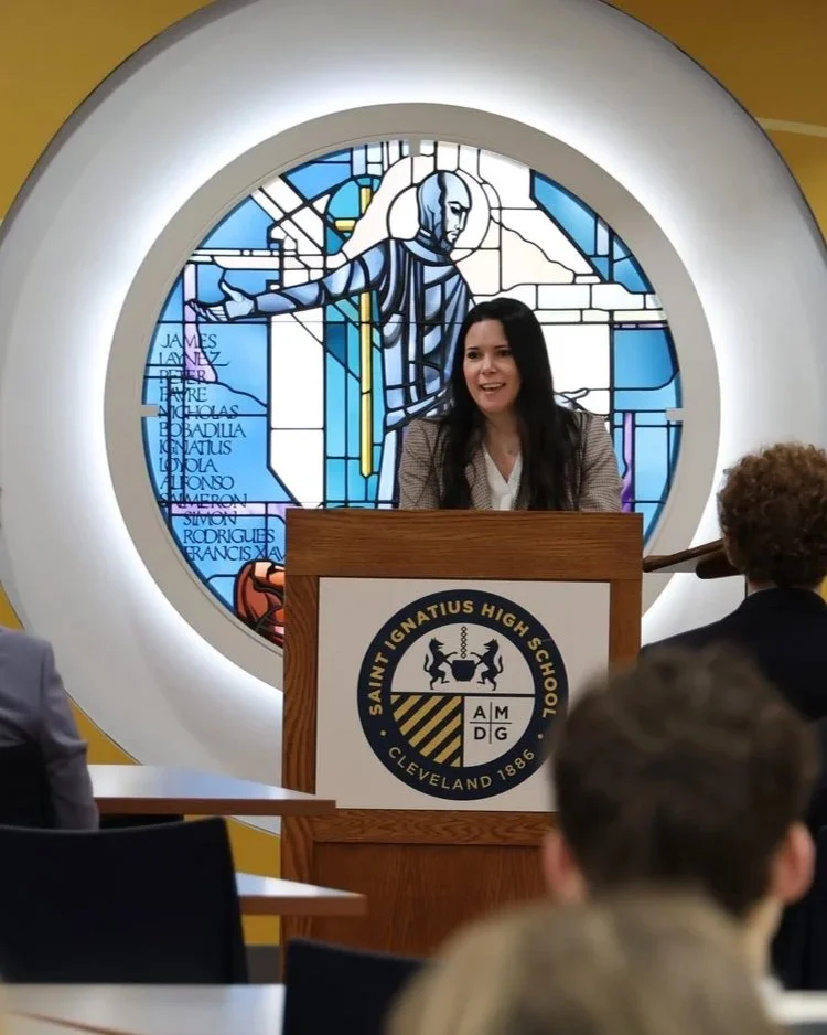 Dr. Terra Caputo addresses a student research symposium on artificial intelligence at Saint Ignatius High School in Cleveland.