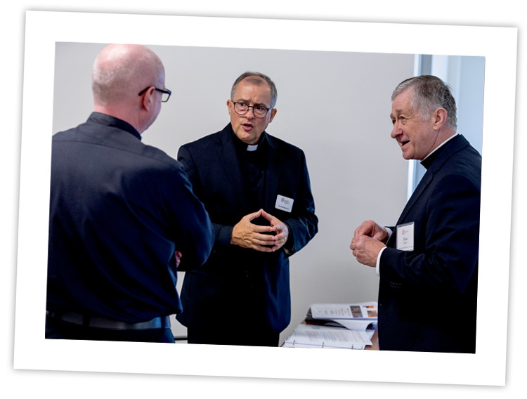 The Very Rev. Fr. Karl J. Kiser, SJ, chats with Fr. Jim Prehn, SJ, (left) and Cardinal Blase J. Cupich (right) during a higher education colloquium at the Midwest Jesuits province offices in Chicago on Sept 6, 2023.